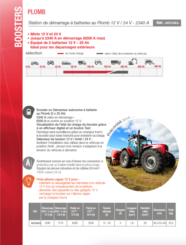 Booster ou Démarreur autonome à batterie au Plomb (2 x 25 Ah) 2340 A utiles en démarrage - 6200 A en pointe en position 12 V Visualisation de l’état de charge du booster grâce à un afficheur digital et un bouton Test